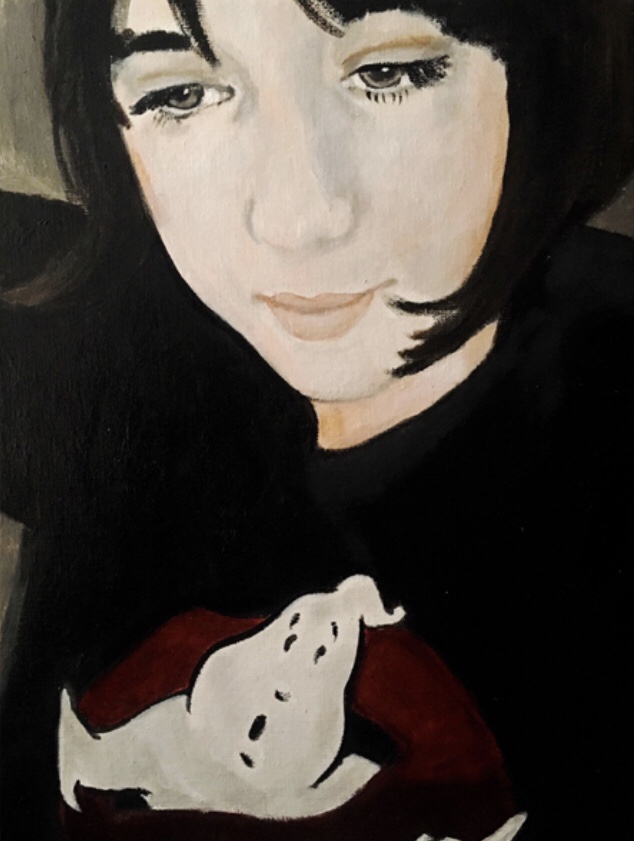 I feel happy with this portrait of my friend and artist Lucy Cox. I think it accurately depicts her gentleness (as a strength). It catches her in a moment of self-reflection where we wonder what she might be thinking or feeling, which leads us right into the painting. This moment of introspection adds to the intrigue of the portrait and the Ghostbusters motif brings a sense of playfulness but also perhaps a point of tension. There is also a sense of silence to the painting — a stillness and peace and a feeling that this person knows who she is. I hope it also captures the physical beauty of Lucy’s face — she has the ‘Marilyn’ light to her skin where she often seems to be lit from within. What also makes me happy is that when I look at this portrait I think of cherry blossom and I think that’s quite a beautiful metaphor for Lucy.