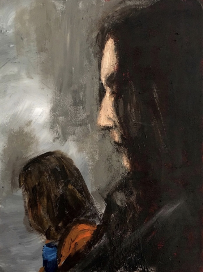 There is a sense that the child is leaning towards a different reality — as if she is about to turn to her right towards a captivating light — towards something mysterious. As I’ve written before, I’ve been intruiged by my daughter’s ability (and all young children do this) to suddenly become entranced (and visibly so), often seemingly by nothing in particular. Three of my paintings explore this (the two below and Edie in white jumper (2013)).