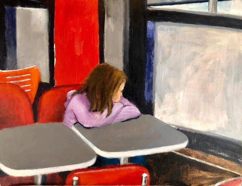 There’s not a lot going on in this painting, so it seems. Two figures inhabit a shared space and we hardly see their faces (only a sliver of mine in profile). They are together, yet very much preoccupied with their own thoughts.