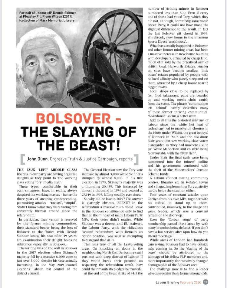 I was delighted when John Dunn, from the Orgreave Truth and Justice Campaign, asked if he could use an image of one of the portraits to illustrate an article he’d written about Dennis losing his Bolsover seat in the 2019 general election (see second image below).