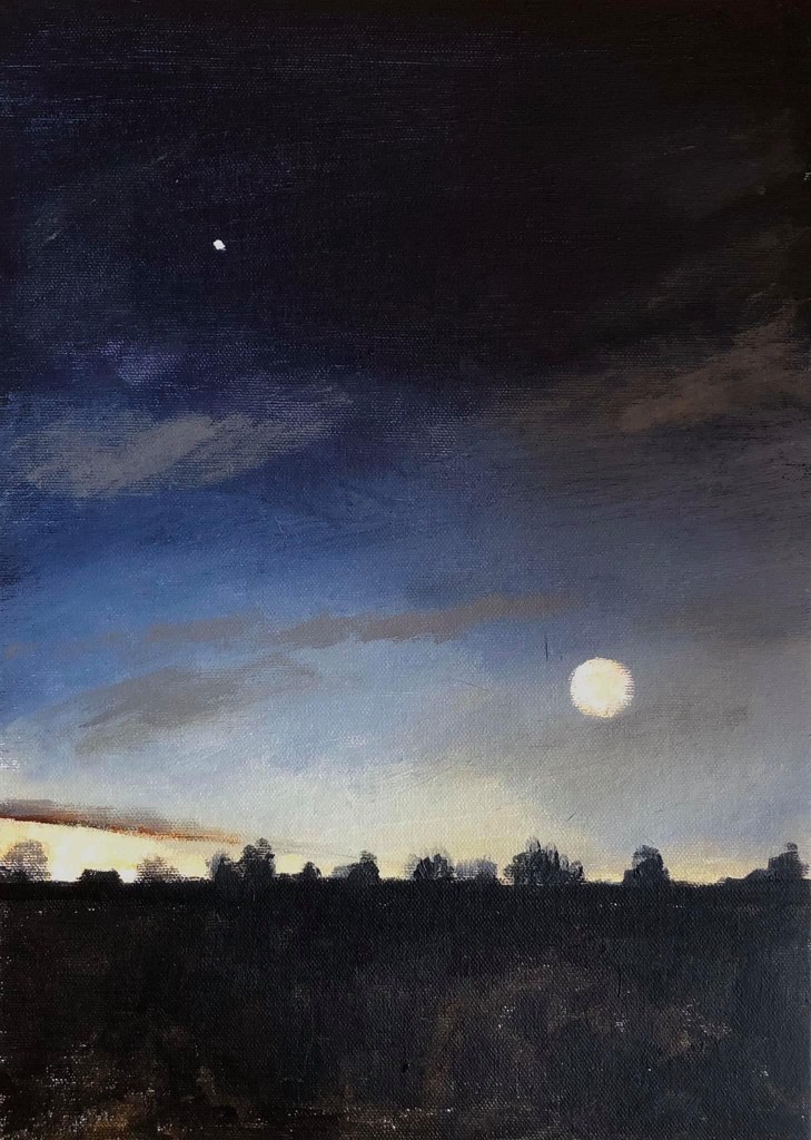 I’ve painted the moon many times, often with Venus. Any conjunction between the moon and Venus will always be stunning — Venus is the second-brightest natural object in the night sky after the moon and together they are particularly spectacular. To me they seem to be old friends — revelling in each other’s beauty and whispering tales of the universe to each other.