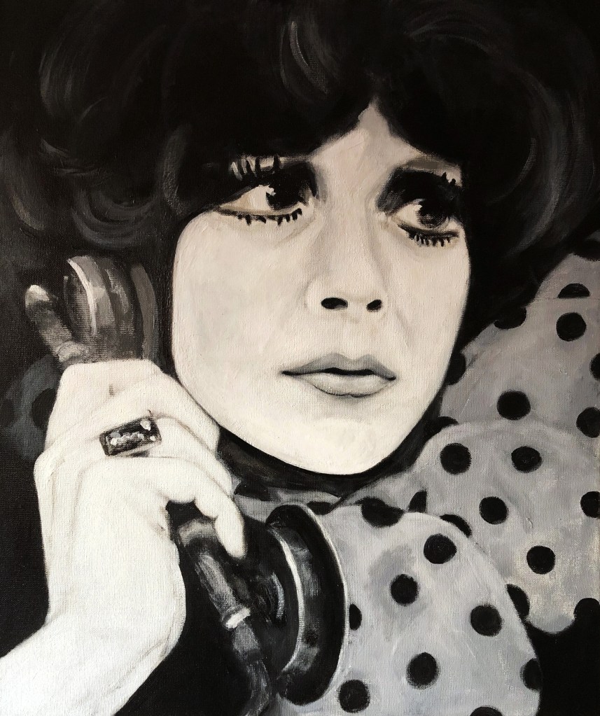 To pay tribute to Fenella, I’ve commissioned a total of fifteen paintings from five artists (Natalie Dowse, Sal Jones, Cathy Lomax, Jeanette Watkins and myself). Through these new works, we examine Fenella and her life through five prisms: Fenella the theatre actress; the film and television actress; her carefully crafted image (the makeup, the wigs, and THOSE eyelashes!); the infamous Carry On Screaming ‘smoking’ scene (but from a slightly different angle) and Fenella herself, in more unguarded moments, where we may perhaps catch a glimpse of Fenella when she is not acting.