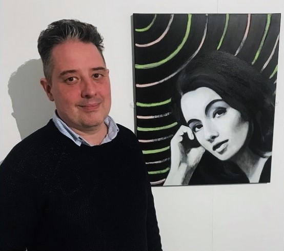 Seymour Platt with a portrait of his mother, Christine Keeler, painted by Fionn Wilson (De Montfort University/PA) (3rd March, 2023)
