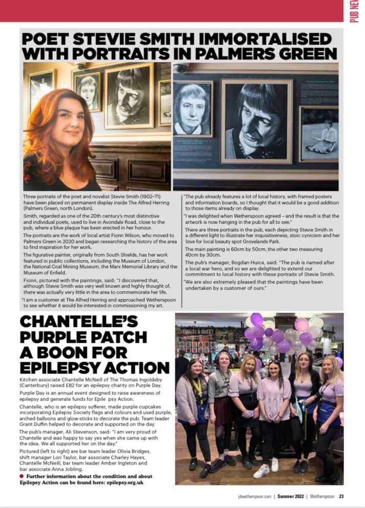 An interview with Wetherspoon News about my three portraits of poet Stevie Smith (commissioned by Wetherspoon), now hanging in ‘The Alfred Herring’ (Palmers Green). You can read it online HERE.