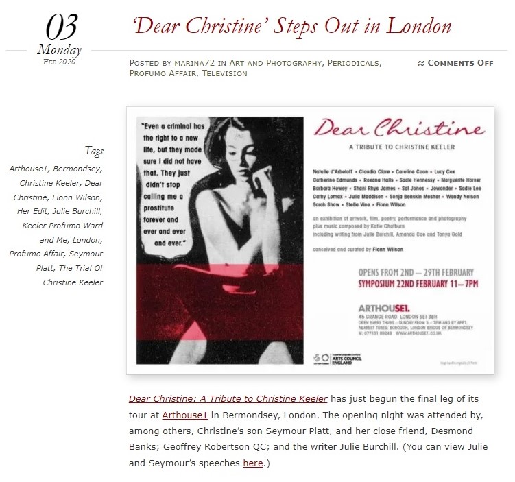 It’s fantastic to be mentioned in The Telegraph by journalist Tanya Gold, who has always championed Christine Keeler’s cause: